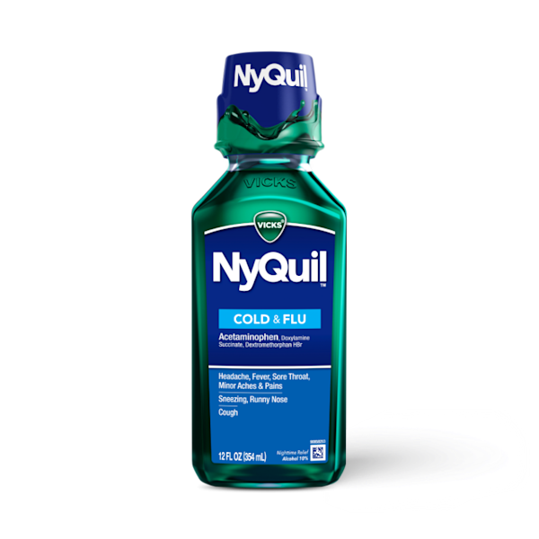 Vicks NyQuil Cold & Flu Liquid Medicine provides fast, powerful relief for your worst cold and flu symptoms. When cold symptoms keep you up, turn to Vicks NyQuil Cold & Flu nighttime relief medicine to help you get the rest you need. When you need fast relief, this powerful, multi-symptom relief medicine treats headache, fever, sore throat, minor aches and pains, sneezing, runny nose, and cough due to minor throat and bronchial irritation. Nothing works faster. Vicks NyQuil is the #1 pharmacist recommended nighttime cough, cold & flu brand*
